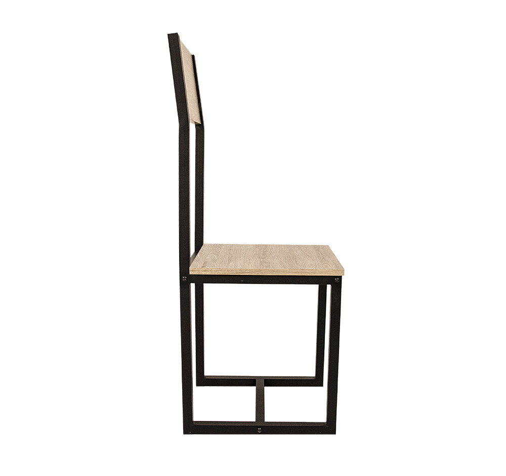 Стілець обідній поєднує в собі металеву профільну трубу та товсту ламіновану ДСП. Завдяки міцним і надежним матеріалам кухонний стілець витримує високі навантаження і має тривалий термін служби. Конструкція не містить нічого лишнього, за рахунок чого стілець компактний і не захаращує простір. площадках.