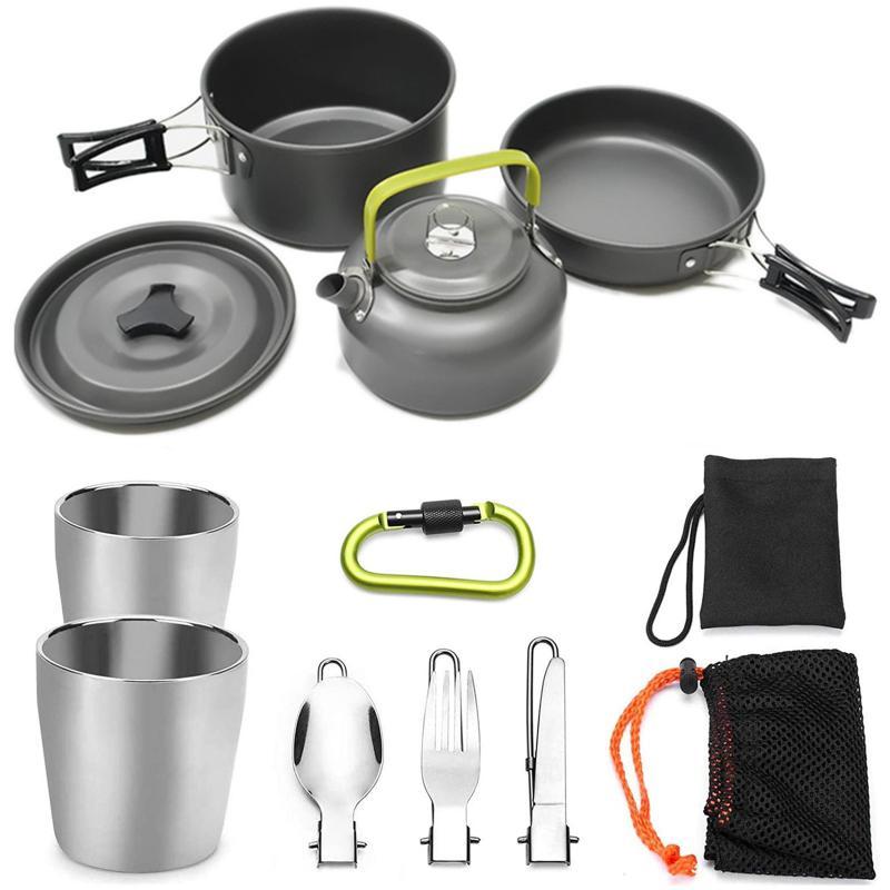 Комплектація: казан, сковорідка, чайник з ручками, 2 термокухлі, виделка, ніж, ложка, кришка, карабін, чохол для зберігання.